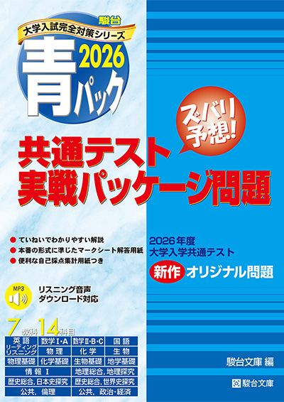 「青パック(市販版)」は共通テストを予想して作成した新作問題、全科目1回分を収録しております。科目別の問題冊子で、本番さながらの雰囲気で実力チェックができます!共通テスト本番前の最終確認にぜひご使用ください。