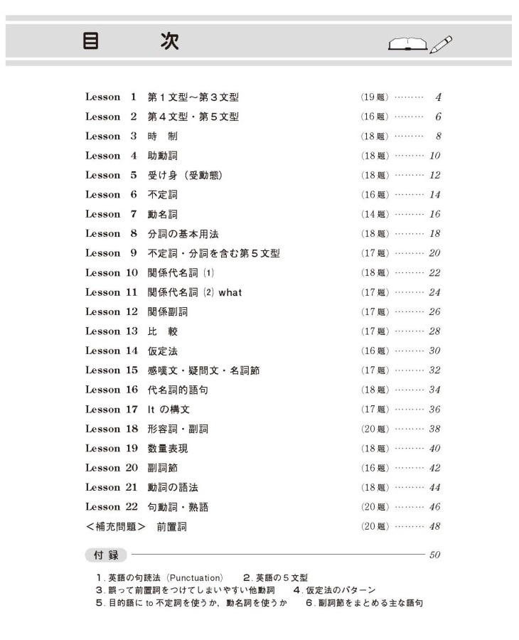 ★練習問題は、「適語選択」「空所補充」「語形変化」「英文合成」「整序作文」「誤文訂正」「英文完成」「和文英訳」などの記述問題。