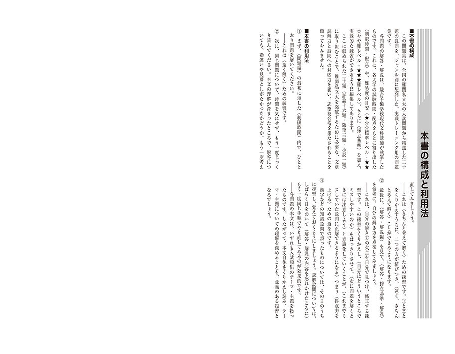 現代文読解問題 難関私大編 清水正史 編 問題集 中級|上級 難関私立大学の入試問題から精選した20題の良問を,ジャンル別に配列した問題集。 サンプルページはこちら 高校生|高3 国語 現代文 著者 清水正史 編 価格 定価:838円(10%税込) 対象高校生|高3 科目現代文 ISBN 978-4-7961-1429-5 書籍体裁 B5/224頁 高等学校採用限定図書「高校採用限定書籍」は学校向けに販売している書籍となります。 ご購入の際には貴校担当書店,もしくは駿台文庫担当者までご注文ください。 ご採用注文書はこちら ご購入について 取扱書店