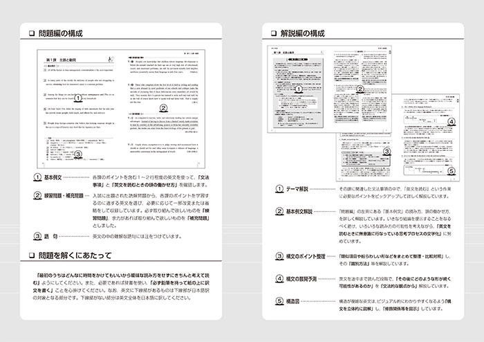 「構文のポイント整理」や「構造図」で視覚的に英文を理解し,英文を細分化した丁寧な解説で,読解に必要な思考プロセスを学ぶことができます。