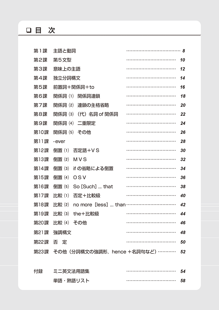 大学入試に出題された英文の中から「読みづらい部分」だけを抜き出して,そこに含まれている文法項目別に問題を整理・配列しています。