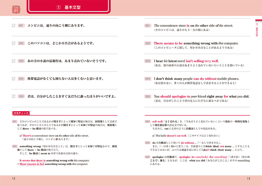 英語の発想と感覚を身につけながら,英語を書く実力を養うことができる,英作文の実戦的例文集。すべての例文に内容をより充実させた「文法チェック」がついており,英文構造の根本的な理解が可能です。付属の音声にはアメリカ人のナレーションで英文を収録してありますので,発音・アクセントの確認や,リスニングの基礎力養成にも効果的です。また,巻末付録として「英文法の最重要項目」について,他では扱っていない「とっておきの解説」を載せた「英文法道場」のページが付いています。