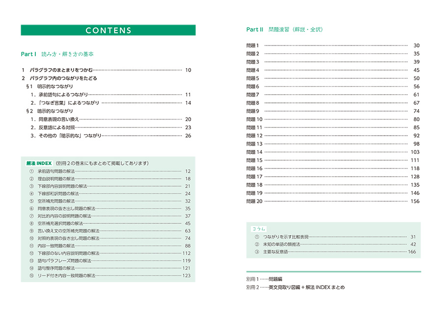 国公立大二次試験で頻出の「読解総合問題」攻略の着眼点を解説した問題集です。改訂にあたり,全20題の「英文見取り図」を新たに掲載。解説とあわせて読めば学習効果は抜群です。“言い換え”,“具体化”,“対比・対照”,“因果関係”など,“文脈上のつながり”を見抜く力を養成します。