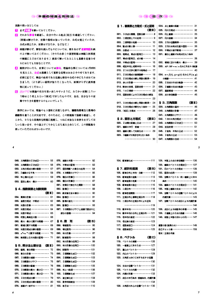 ◆各テーマは例題、例題の解答、復習問題で構成され、復習問題は例題に対応した類題となっています(復習問題の解答は別冊子に収録)。また、例題の解説には解くうえで必要な公式や定理、解法の指針を明示してあります。
